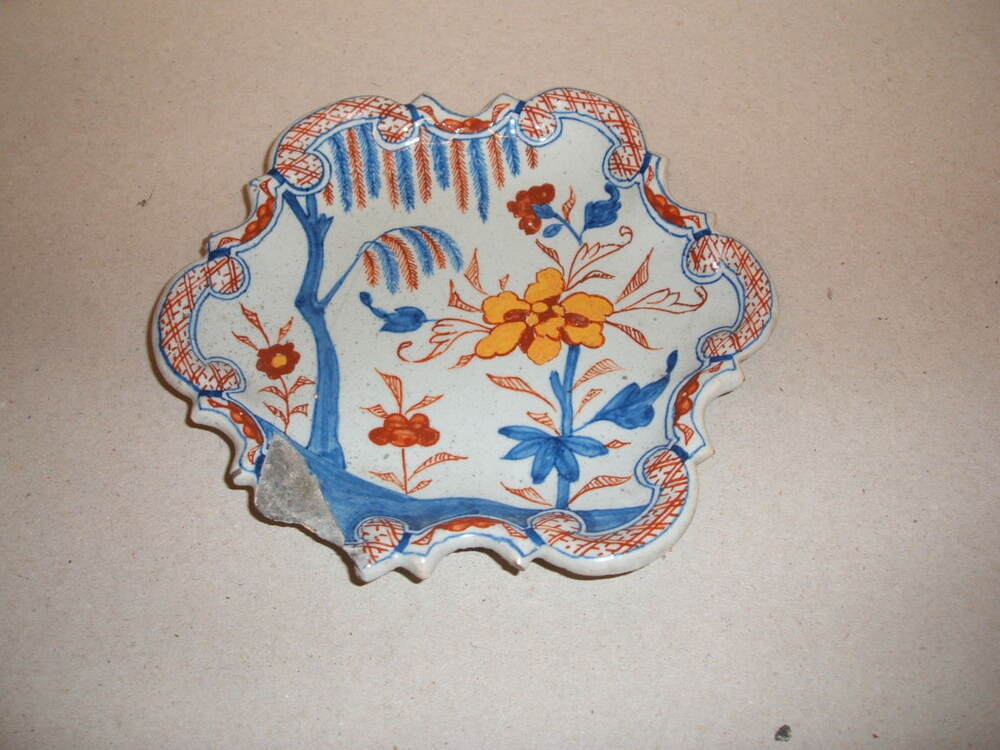 Zeskant schaaltje met een veelkleurig decor. De rand is ornamentaal gevormd en gedecoreerd met een rasterwerk. Centraal een decor met een boom, planten en bloemen. Naar chinees voorbeeld. Vermoedelijk van een andere fabriek (Delft ??) en niet uit Makkum