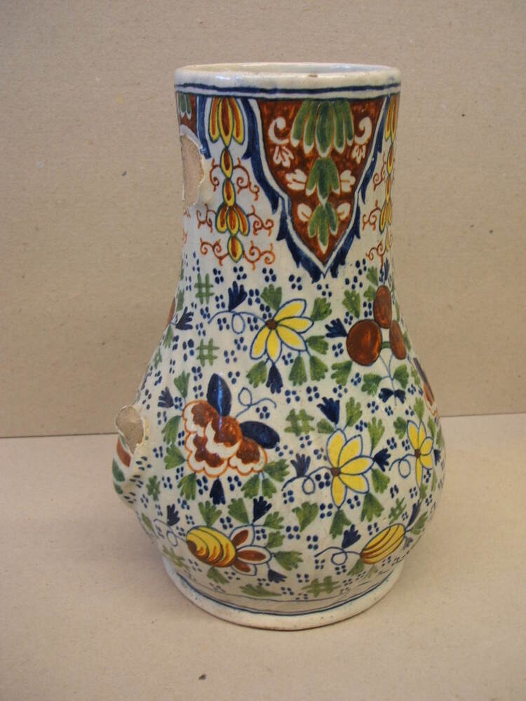 Kan, met veelkleurig driedelig ornamnetaal / floraal decor. Decor wordt ook wel peterselie-decor genoemd. Op de onderzijde staat APK, het is een Delfts merk waarvan veel imitaties op de markt zijn gebracht, vaak veelkleurig. De kan is vermoedelijk van de fabriek Fourmaintreaux in Desvres. Maar de overeenkomst van deze kan met de kan van Makkum ...