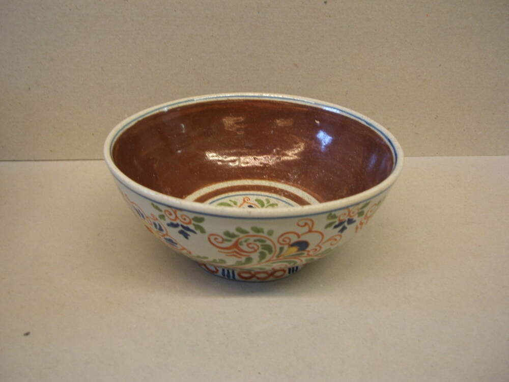 Kom, met veelkleurig floraal decor, naar chinees voorbeeld. Aan de binnenzijde een centraal floraal decor en verder ringen in blauw en daartussen ingevuld met bruin
