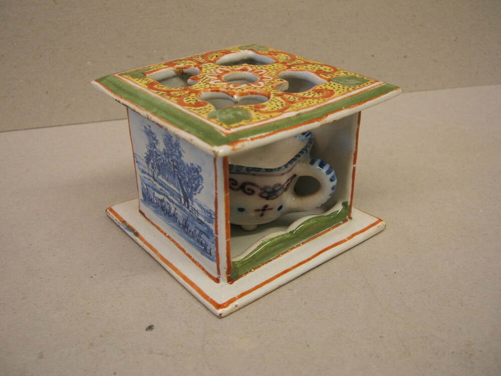 Stoof behorend bij de groep miniaturen, met veelkleurige florale decoratie en op de zijden in blauw een voorstelling van een landschap. In de stoof een miniatuur test beschilderd met blauwe en paarse florale en geometrische motieven, vermoedelijk hoort deze test er origineel niet bij