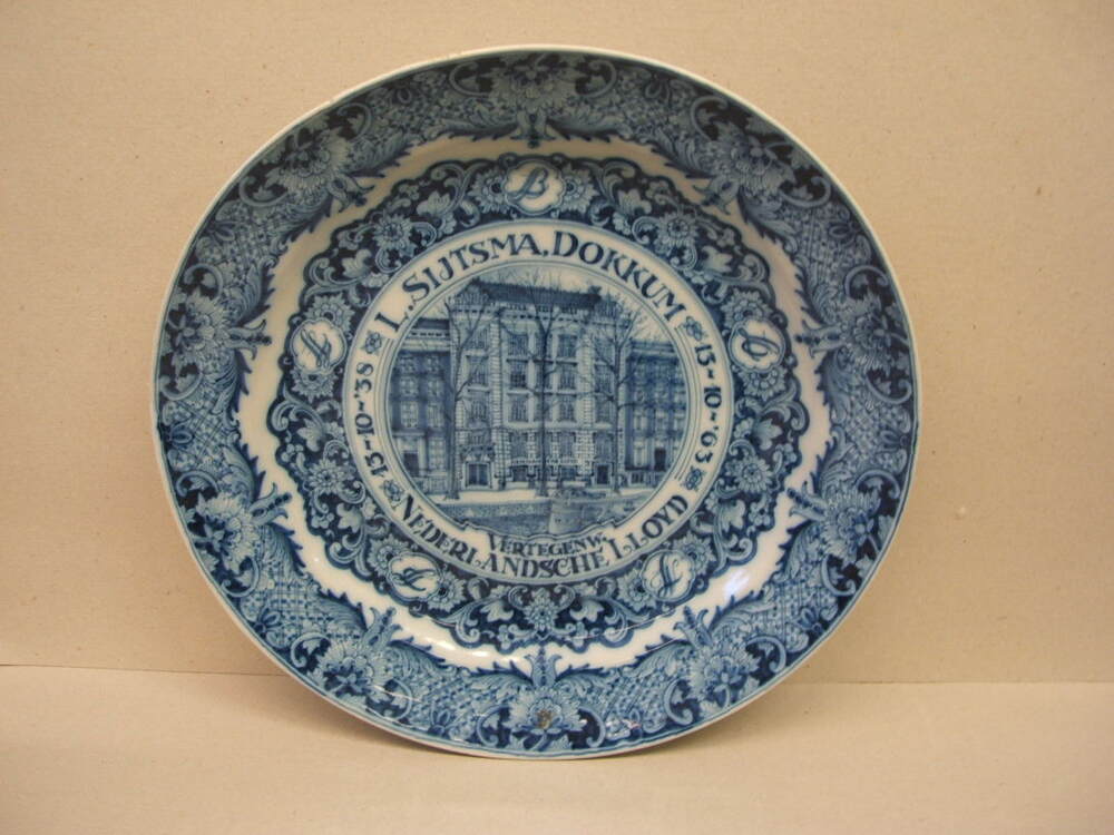 Schotel met decor in blauw, op de rand ornamentale decorrand en centraal binnen een rond ornamentaal decor met daarin weer binnen vijf kleine cartouches verschillende monogrammen een afbeelding van een kantoorgebouw aan een Amsterdamse gracht en daaromheen binnen een bies de tekst L. SIJTSMA, DOKKUM, 13-10-38, 13-10-68, VERTEGENW. NEDERLANDSCHE LLOYD
