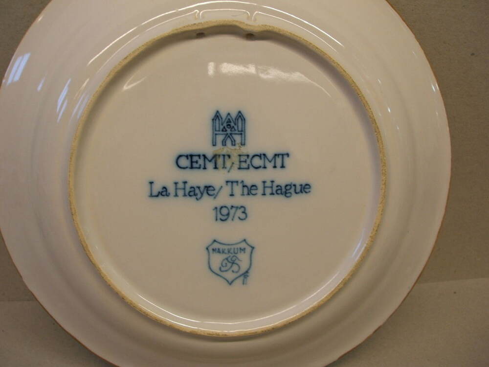 Schotel, met veelkleurig decor, met op de rand een vierdelige ornamentrand. En centraal een voorstelling van een tak met bloemen en knoppen. Naar chinees voorbeeld. Op de achterzijde de tekst; CENT/ECMT / La Haye/The Hague / 1973 en erboven het logo van dit bedrijf.