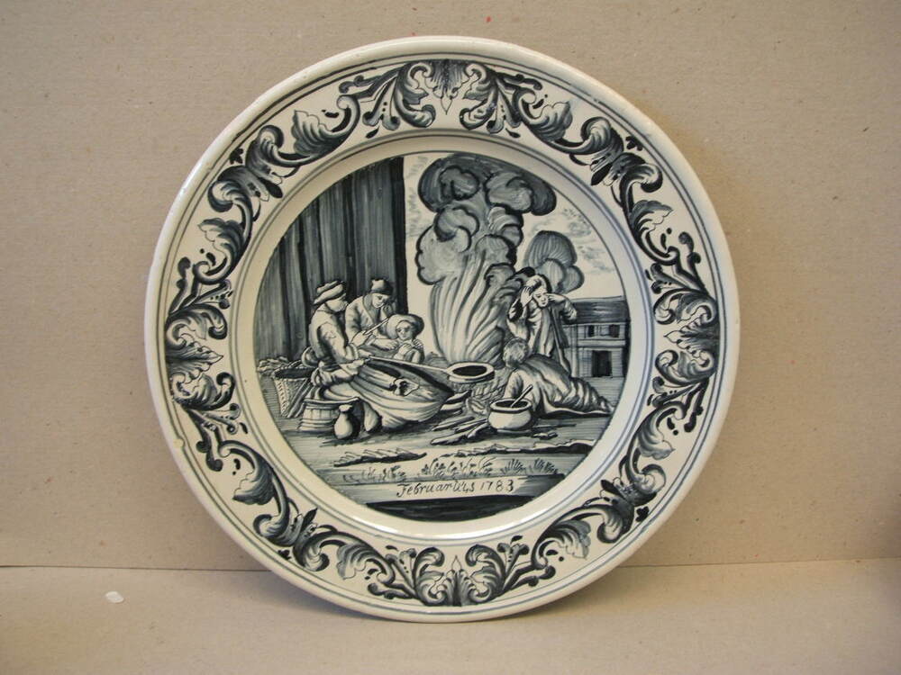 Bord, maandbord van de maand februari. Met decor in blauw, met op de rand een vierdelige ornamentrand. En centraal een voorstelling van een wintervoorstellig met figuren rond een vuur met kookpotten en pannen. Onder de voorstelling staat de tekst; Februarius 1783. Vermoedelijk niet van Makkum maar van een andere fabriek (Delft ??) en in Makkum ...