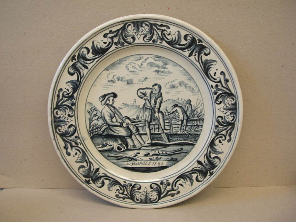 Bord, maandbord van de maand maart. Met decor in blauw, met op de rand een vierdelige ornamentrand. En centraal een voorstelling van figuren werkend op het land. Onder de voorstelling staat de tekst; Marius 1783. Vermoedelijk niet van Makkum maar van een andere fabriek (Delft ??) en in Makkum als voorbeeld gebruikt.