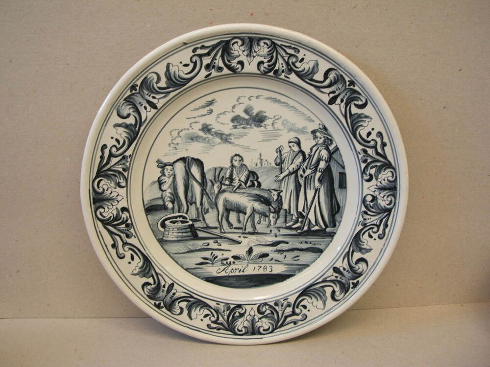 Bord, maandbord van de maand april. Met decor in blauw, met op de rand een vierdelige ornamentrand. En centraal een voorstelling van figuren op een erf met vee. Onder de voorstelling staat de tekst; April 1783. Vermoedelijk niet van Makkum maar van een andere fabriek (Delft ??) en in Makkum als voorbeeld gebruikt.