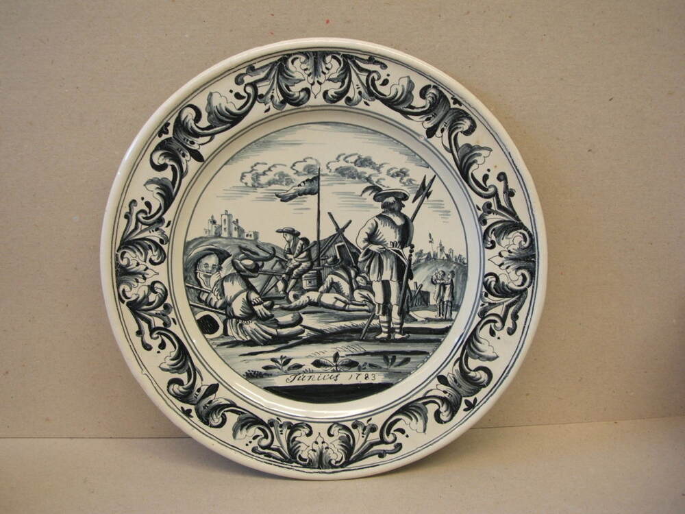 Bord, maandbord van de maand juni. Met decor in blauw, met op de rand een vierdelige ornamentrand. En centraal scene met figuren rustend op het land, met op de achtergrond twee dorpen. Onder de voorstelling staat de tekst; Június 1783. Vermoedelijk niet van Makkum maar van een andere fabriek (Delft ??) en in Makkum als ...