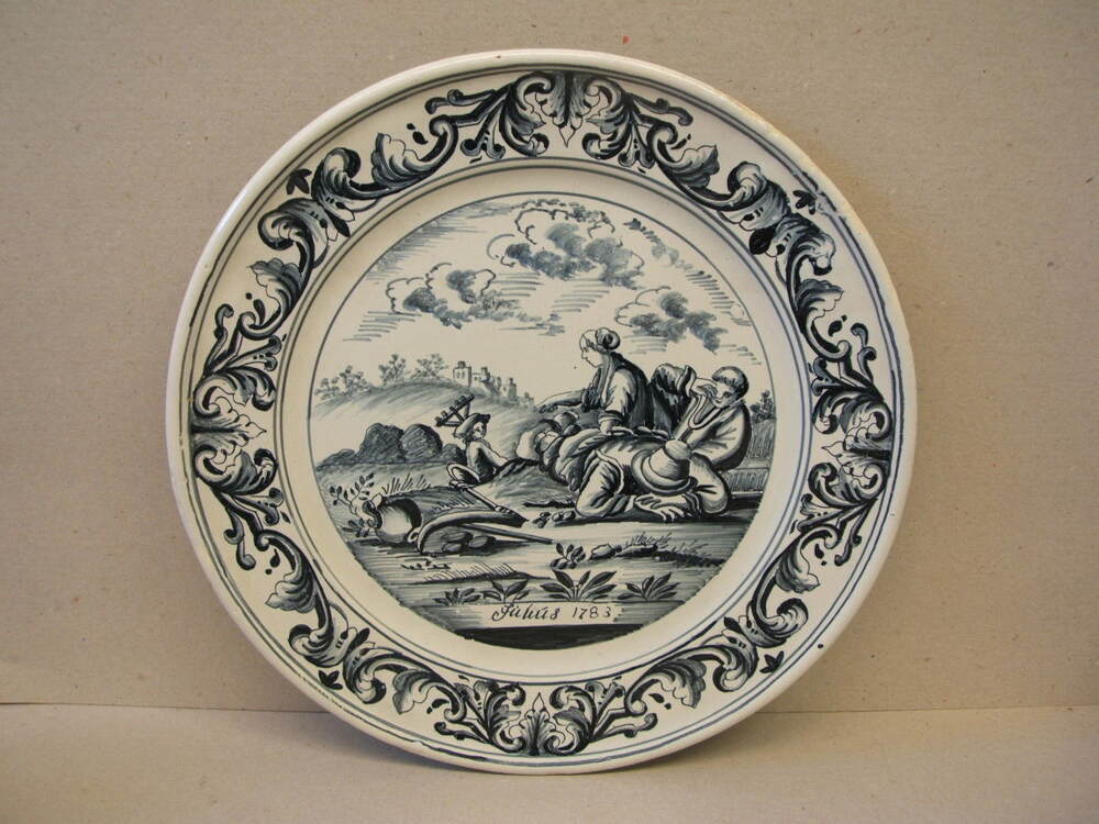 Bord, maandbord van de maand juli. Met decor in blauw, met op de rand een vierdelige ornamentrand. En centraal scene met figuren rustend op het land (in maaitijd ??). Onder de voorstelling staat de tekst; Július 1783. Vermoedelijk niet van Makkum maar van een andere fabriek (Delft ??) en in Makkum als voorbeeld gebruikt.