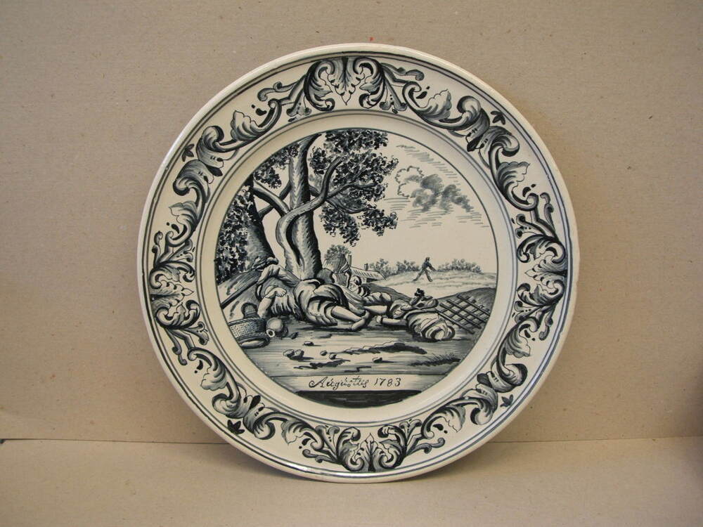 Bord, maandbord van de maand augustus Met decor in blauw, met op de rand een vierdelige ornamentrand. En centraal scene met figuren rustend op het land onder de bomen. Onder de voorstelling staat de tekst; Aúgústus 1783. Vermoedelijk niet van Makkum maar van een andere fabriek (Delft ??) en in Makkum als voorbeeld gebruikt.