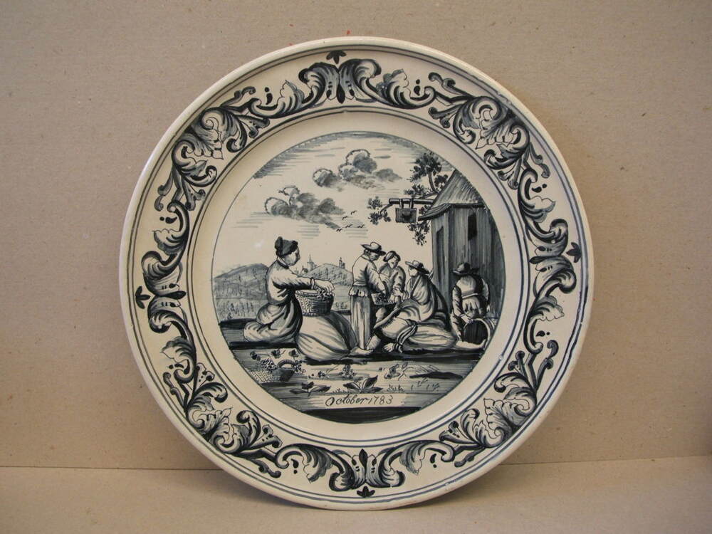 Bord, maandbord van de maand oktober Met decor in blauw, met op de rand een vierdelige ornamentrand. En centraal scene met figuren met manden en fruit op een erf bij een herberg (?). Onder de voorstelling staat de tekst; October 1783. Vermoedelijk niet van Makkum maar van een andere fabriek (Delft ??) en in Makkum ...