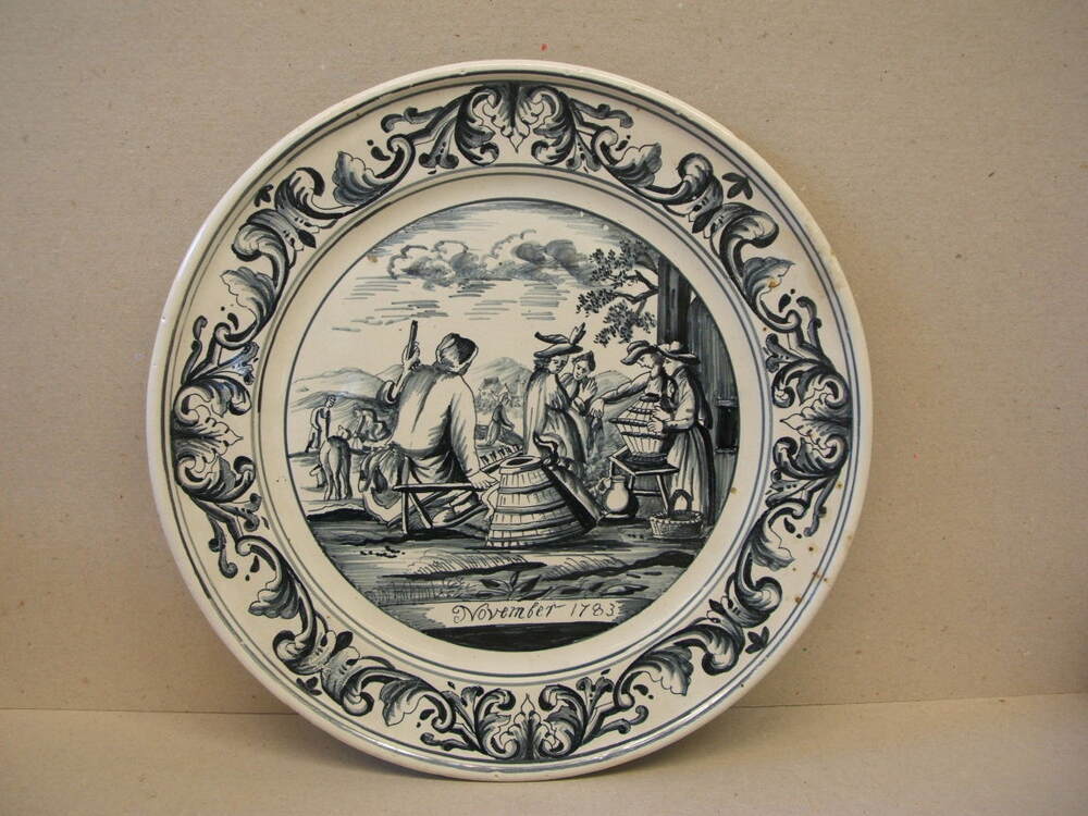 Bord, maandbord van de maand november Met decor in blauw, met op de rand een vierdelige ornamentrand. En centraal scene met figuren werkend op het land en bezig met het maken van manden o.i.d.. Onder de voorstelling staat de tekst; November 1783. Vermoedelijk niet van Makkum maar van een andere fabriek (Delft ??) en in ...