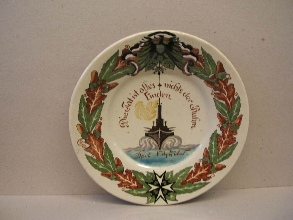 Bord, met veelkleurig decor. Op de rand een slinger van eikenbladeren met onderin een Duits oorlogskruis en bovenin de Duitse Adelaar (Duitse rijkswapen) en een lauwerkrans. Centraal een voorstelling met een oorlogsschip op zee en de tekst; Die Tat ist alle nichts der Ruhm / Enden / en een signatuur. Op de achterzijde een sticker ...