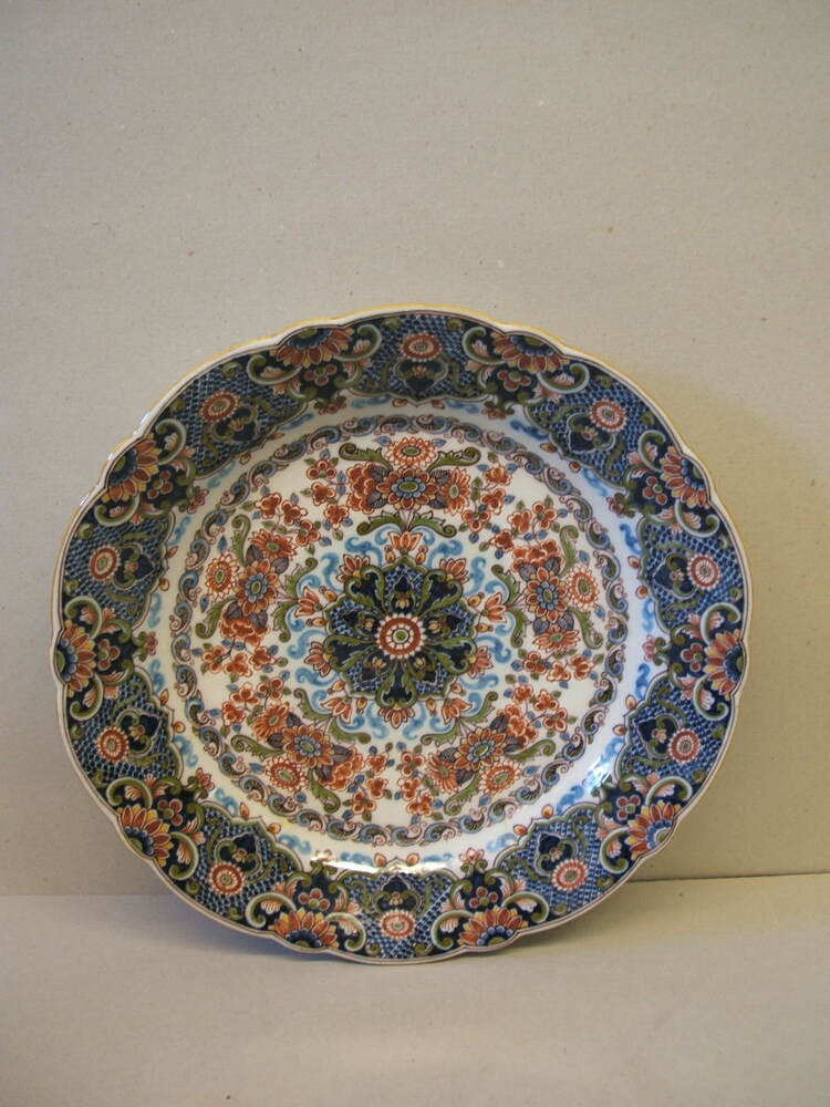 Bord, met veelkleurig decor. Op de rand een tiendelig ornamentaal decor en centraal binnen een ornamentrand een vijfdelig ornamentaal decor.