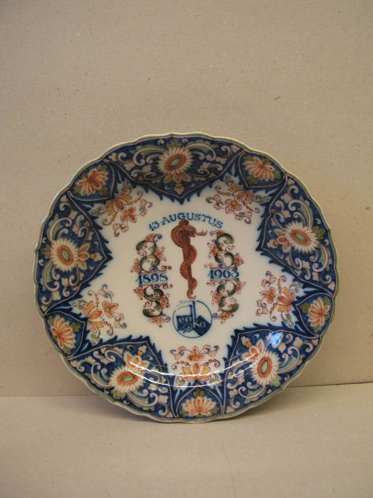 Schotel, met veelkleurig decor. Op de rand een vijfdelig ornamentaal decor en centraal het symbool van de geneeskunde met een slang (Aesculaab) met daarboven de datum 13 AUGUSTUS en daaronder het logo van ENKA (??)..... Aan de weerszijden hiervan een ornament met daarin de jaartallen 1898 en 1963.