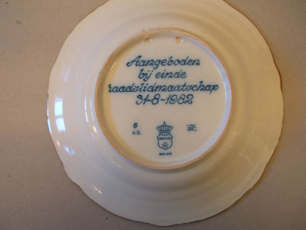Bord, met veelkleurig decor. Op de rand een zevendelig ornamentaal decor en centraal binnen een smalle slingerrand een voorstelling van een raadhuis met daarbij een gemeente wapen. Op de achterzijde de tekst; Aangeboden / bij einde / raadslidmaatschap / 31 - 8 -1982