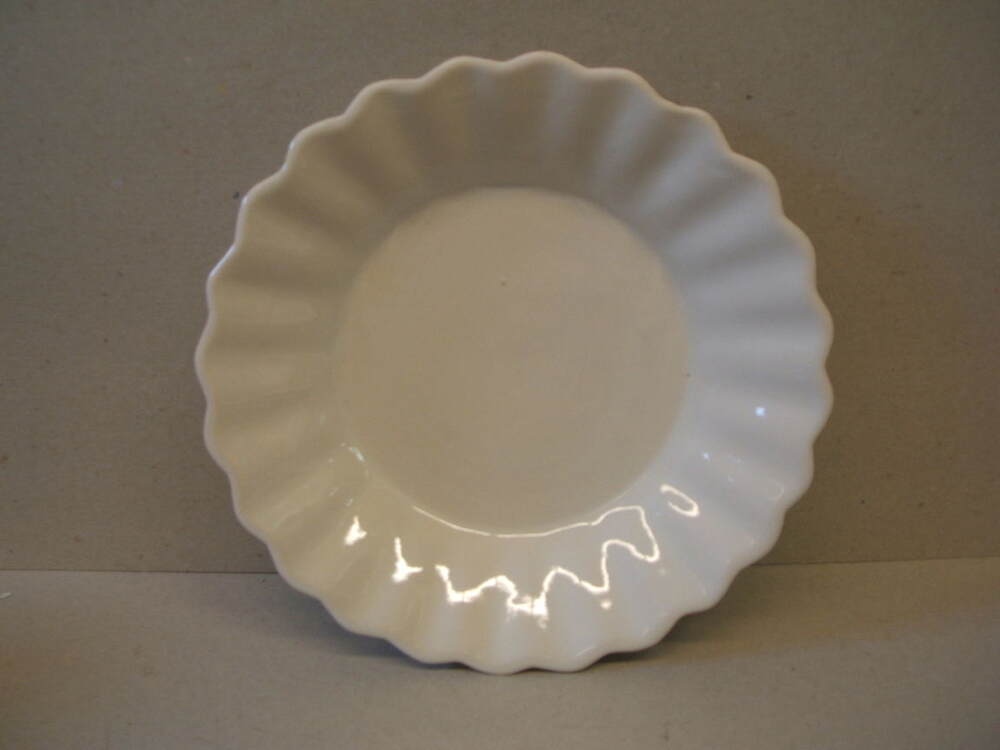 Schaal, geribd schaaltje, met volledig wit glazuur. Op de achterzijde het bedrijfslogo (CCF) van de Cooperatieve Condensfabriek Friesland.