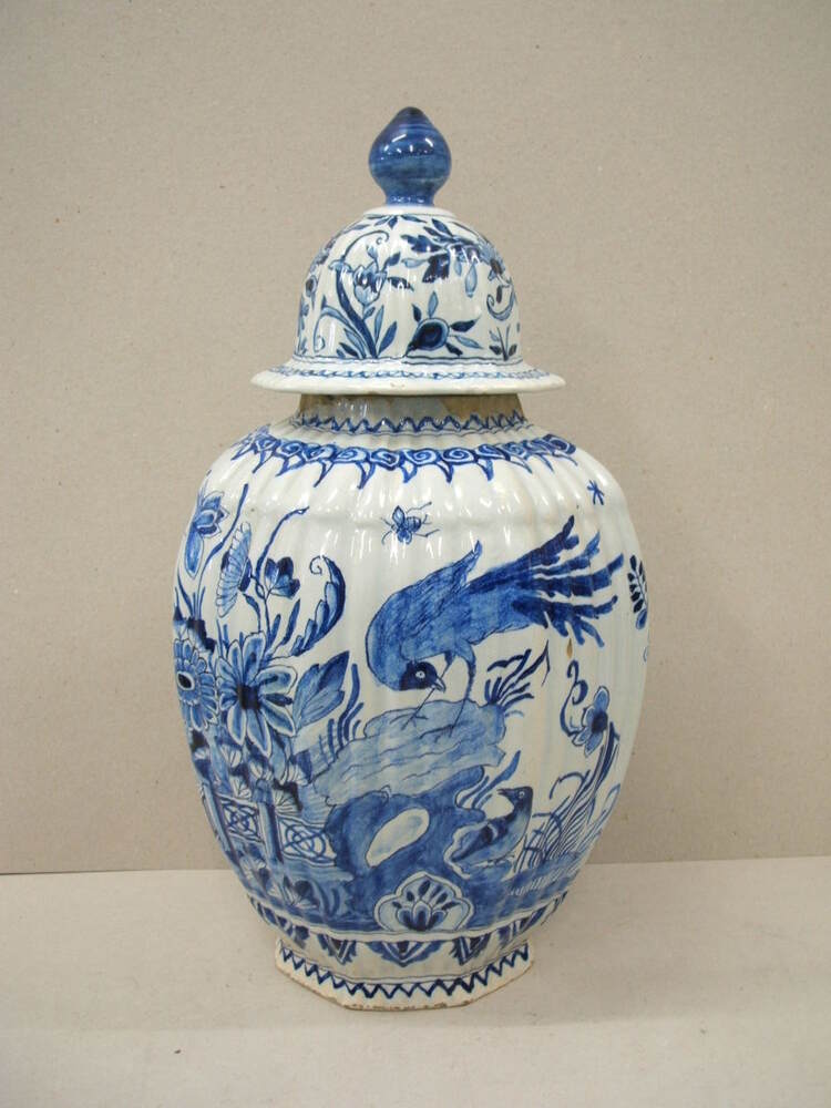 Pot met deksel, met decor in blauw. De pot heeft boven en onderaan een ornamentrand en rondom op de buik een voorstelling van een landschap met bloemen, planten, een hek, een vogel op een rots, andere vogels en insecten. Alles naar chinees voorbeeld. De deksel heeft een floraal decor en een blauwe knop. De pot ...