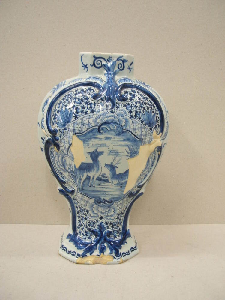 Pot met deksel, met decor in blauw. Aan de voorzijde heeft de pot op de buik een grote ornamentale cartouche deels in relief met daarin een voorstelling van een landschap met twee herten. Op de achterzijde heeft de pot een simpel floraal decor. De deksel die bij deze pot hoort ontbreekt.
