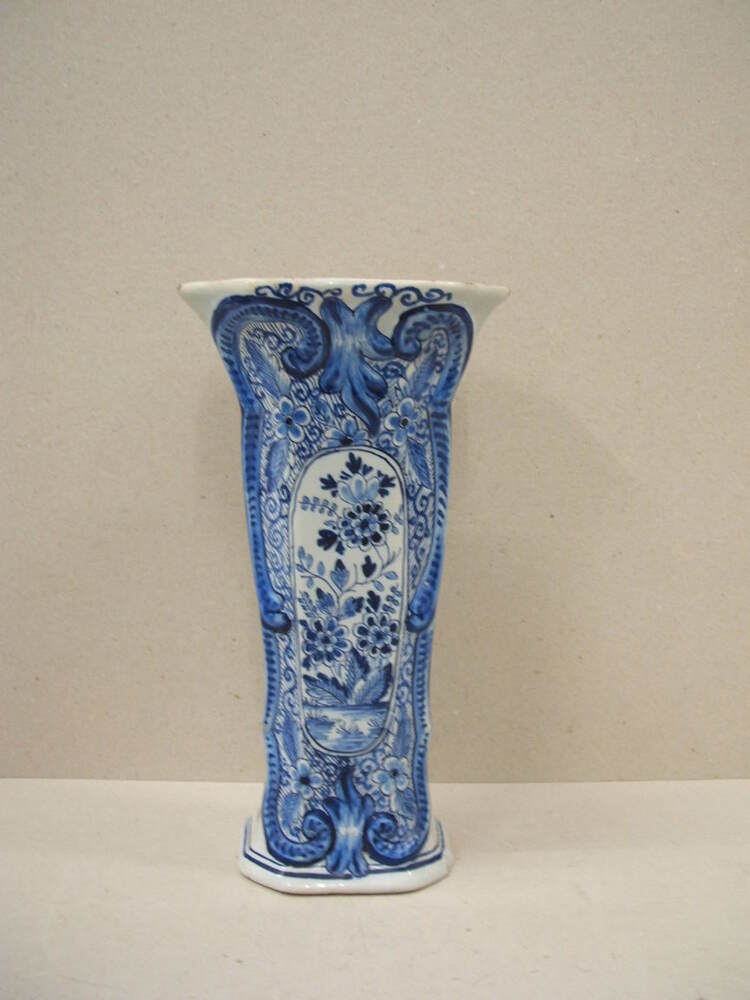 Vaas, met decor in blauw. De vaas heeft aan de voorzijde een groot ornamentaal cartouche deels in relief, met daarbinnen een voorstelling met verschillende bloemen en planten. Op de achterzijde heeft de vaas een simpel floraal decor. De vaas heeft geen merk, het is mogelijk dat de vaas in een andere fabriek (Delft??) gemaakt is.