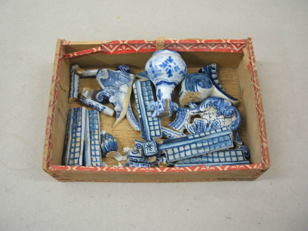 Diverse fragmenten blauw gedecoreerd goed. Het zijn allemaal afgebroken deeltjes van verschillende objecten van Makkum (waaronder pootjes en delen daarvan van minatuur stoeltjes, krukjes en / of bankjes). Het is een verzameling van diverse fragmenten bijelkaar in een houten kistje.