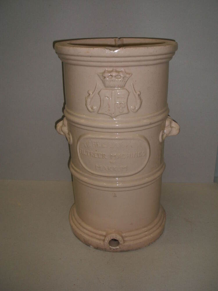 Cilindervormige water filtreer met deksel, maar bij dit voorbeeld ontbreekt de deksel. Gemaakt naar voorbeeld van de water filtreer van de firma Cheavin in Engeland (zie BCT 1716). Binnenin een los filter. Twee oren in de vorm van leeuwen/ maskerons, als handgrepen aan weerszijde. Aan de achterzijde een gat met een kurk erin, via dit ...