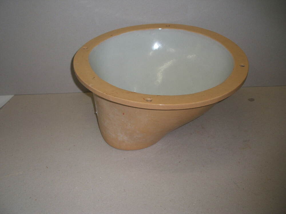 Privaat trechter, met aan de binnenzijde een wit glazuur en aan de buitekant geelachtig oranje glazuur. De platte bovenrand heeft vier gaten, daarmee kon hij worden vastgeschroefd (aan de plank waar hij onder hing of ton).