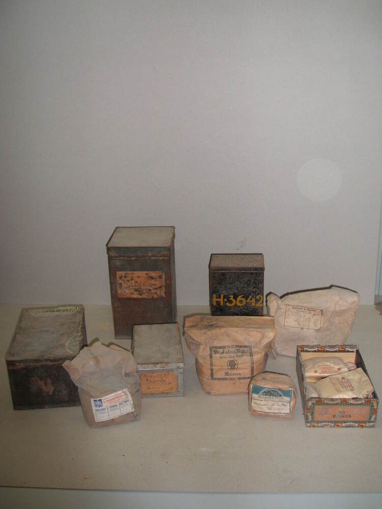 Verschillende ingekochte grondstoffen voor verf. In blikken en zakjes (deels nog met labels) grondstoffen afkomstig van verschillende leveranciers, voor het maken van verfen. Op de foto bij dit record een compilatie van enkele van deze blikken en papieren zakken met grondstoffen.