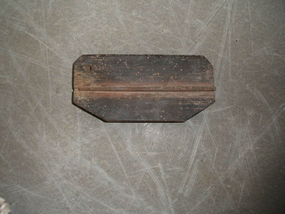Stuk gereedschap, een houtblok met daarop een dun latje dat haaks op het blok staat en is bevestigd via een groefverbinding. Het is onbekend waarvoor het stuk gereedschap is gebruikt en wat het is.