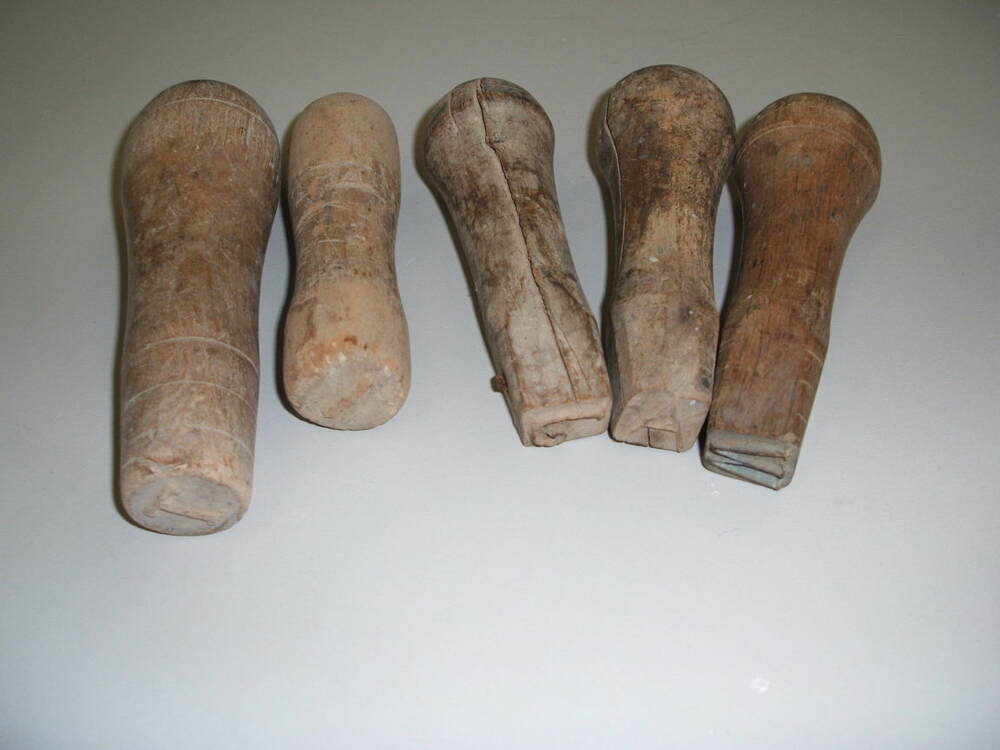 Reliefstempels voor tegels, alle vijf met een verschillende letter als stempel.