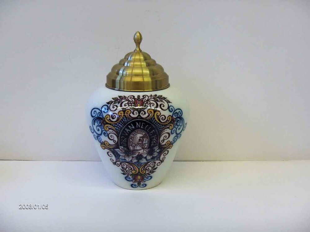 Gelegenheidsopdracht, Snuifpot, wit beschilderd met veelkleurig embleem Van Nelle