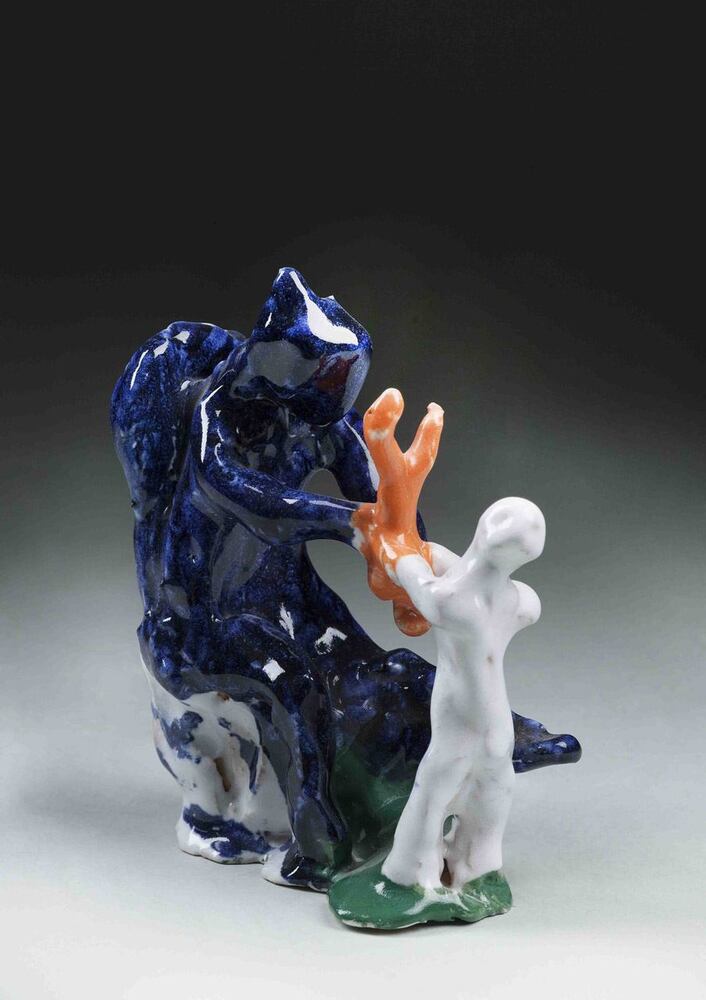 Beeldengroep, waarbij een zittende blauwe figuur en een tegenoverstaande wit geglazuurde figuur een oranje kindje omgekeerd in de lucht werpen (voorstellende geboorte?).