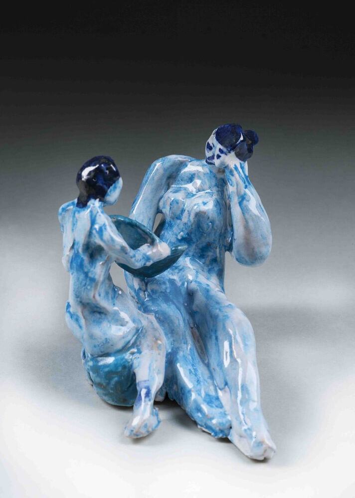 Beeldengroep, waarbij één van de twee blauw geglazuurde zittende figuren de ander een spiegel voorhoudt.