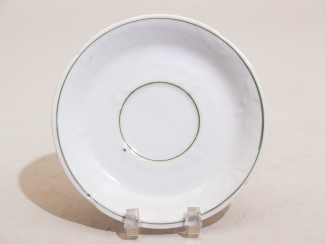 Een schotel van wit porselein met enig flauw floraal reliëf, versierd met groene biesjes.