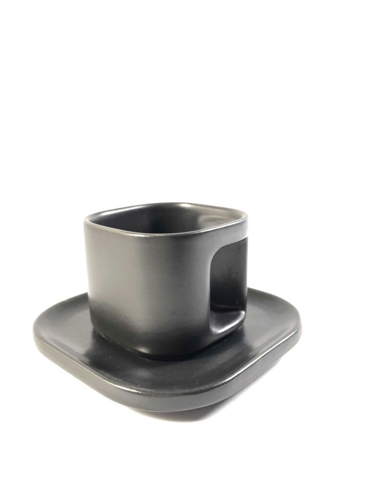 Kop, onderdeel van een kop en schotel met vierkante omtrek binnen de contouren van de vorm uitgespaard oor, overdekt met een mat, zwart glazuur