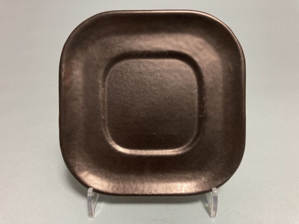 Schotel, onderdeel van een kop en schotel met vierkante omtrek binnen de contouren van de vorm uitgespaard oor, overdekt met een mat, zwart glazuur.