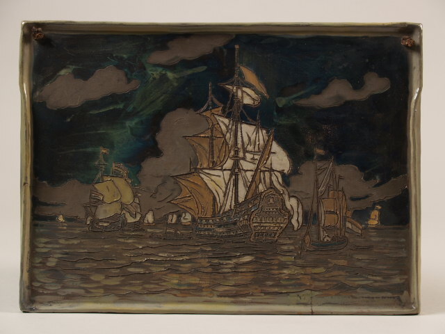 Tegelplaat voorstellende een zeegezicht met schepen, Jacoba aardewerk