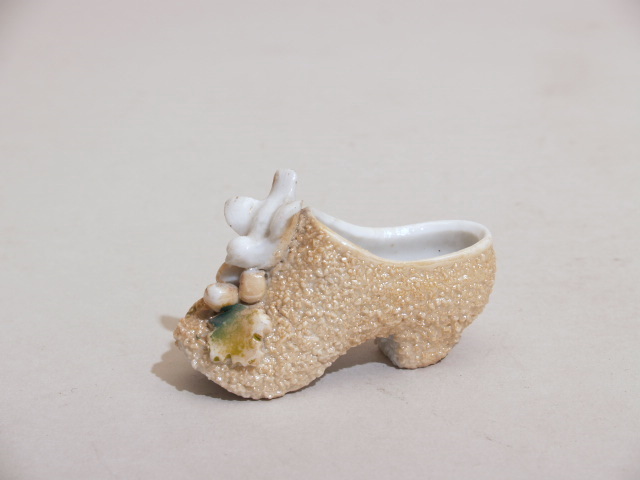 Klomp van porselein, waarvan het oppervlakte grotendeels is gedecoreerd met een fijn gruis en een bruin glazuur. Op de wreef versierd met een gemodelleerde duif een een takje met vruchten.