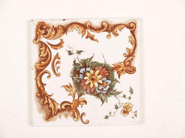 Tegel met een polychroom decor van bloemen in een open cartouche