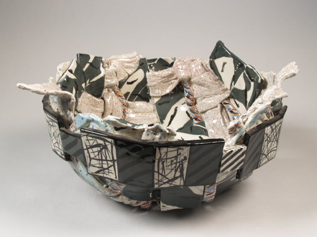 Schaal, die is opgebouwd uit een vlechtwerk van stroken klei. De bovenrand is voorzien van een aangezette vrije vormen. Vrije decoratie met zwarte, grijze en lichtblauwe glazuren