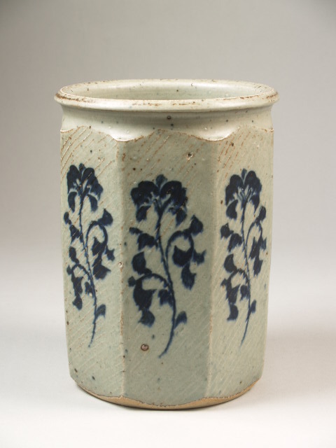 Cilindrische vaas met gefacetteerde zijden. Deze zijn voorzien van een patroon van diagonaal ingekraste lijnen.Daarna in kobaltblauw een floraal decor