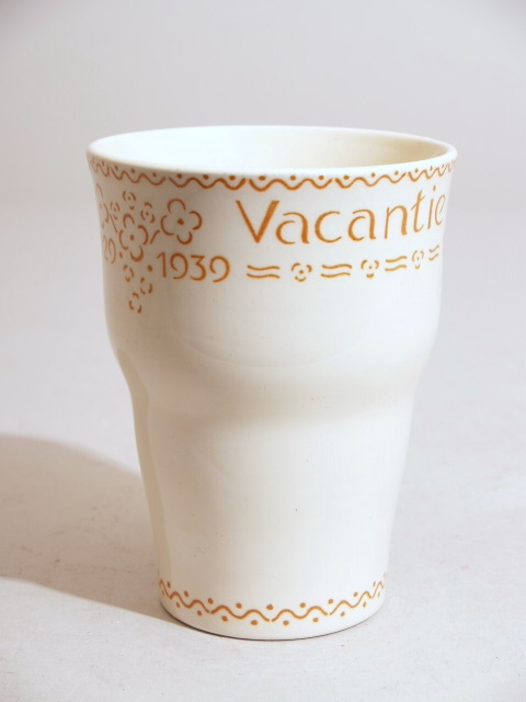 Beker met bruingeel decor met opschrft en bloemmotieven