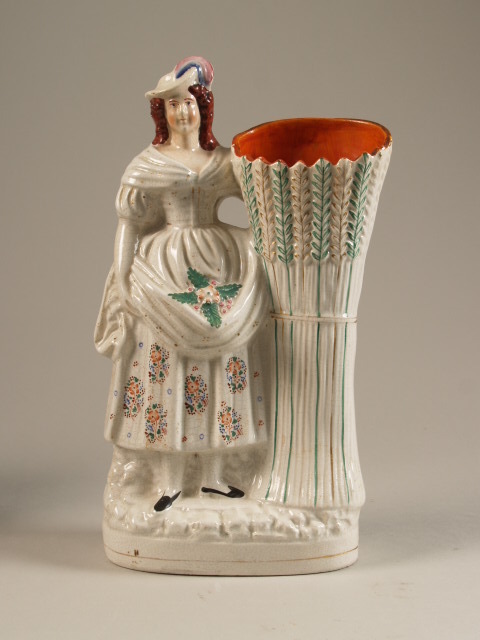 Beeld in vorm van staande vrouw naast vaas in vorm van korenhalm