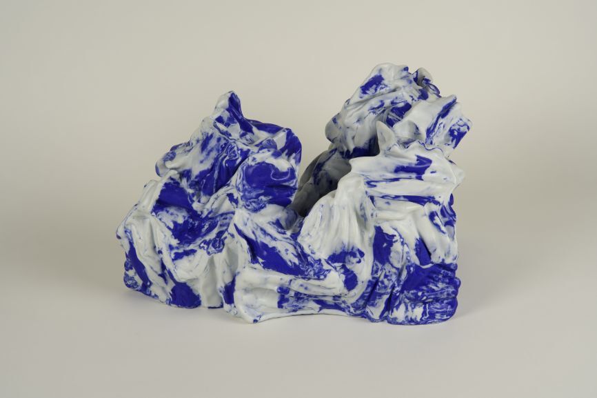 De brede, geplooide wanden van ingekleurd porselein hebben een flinterdunnen huid en zijn hol van binnen. Met soepele plooiingen en dynamische kleurcontrasten bouwt Haenen een intense visuele spanning op. De kunstenares transformeert de potvorm tot een arcadisch landschap. Zij speelt met de schaalverkleining van een mediterraanse rotspartij, die is opgebouwd uit sneeuwwitte en helblauwe kleurschakeringen