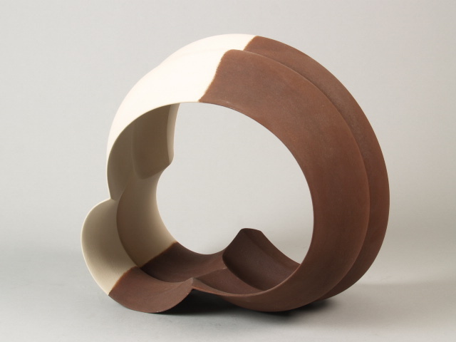 Liggend abstract object bestaande uit een gekantelde dunne cirkelvormige wand. Een helft van het object is donker bruin gekleurd de andere helft is crème-wit gekleurd.