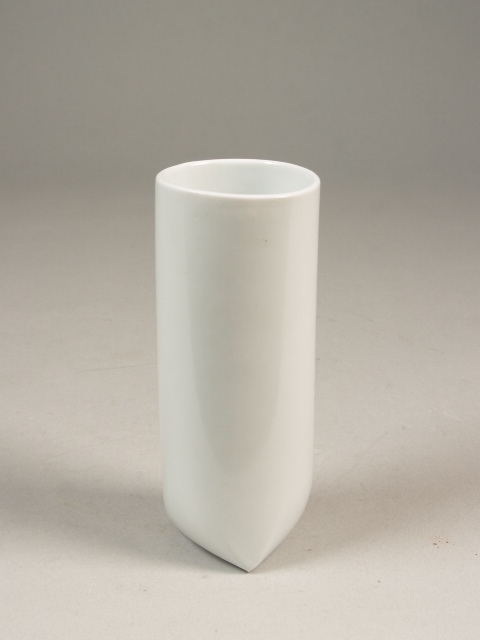 Slanke, cilindrische vaas met driehoekige basis overdekt met een transparant glazuur