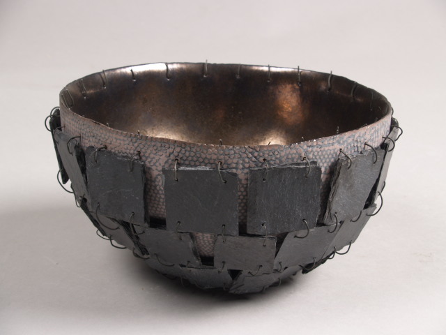 Schaal met dikke wand, buitenzijde voorzien van grijs en lila stippel glazuur. Hier overheen in ijzerdraad vlechtwerk gevatte, rechthoekige stukken leisteen in vier horizontale banden, waarvan de laatste bestaat uit driehoekige stukken. Binnenzijde bronskleurig geglazuurd
