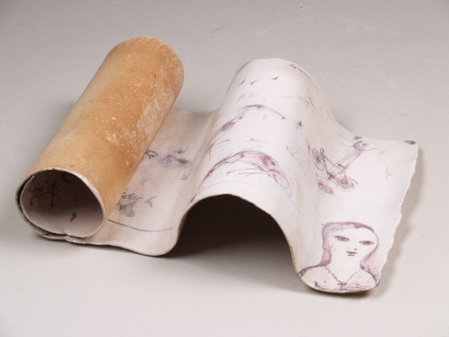 Beeld bestaande uit een vrij gevormde, liggende, gedeeltelijk opgerolde lap klei waarbij aan de binnenzijde een tekening is ingekrast met blauwe en paarse glazuren van fietsen, vogels en een vrouw in een landschap. Overdekt met wit craqueleglazuur. Met textielafdruk