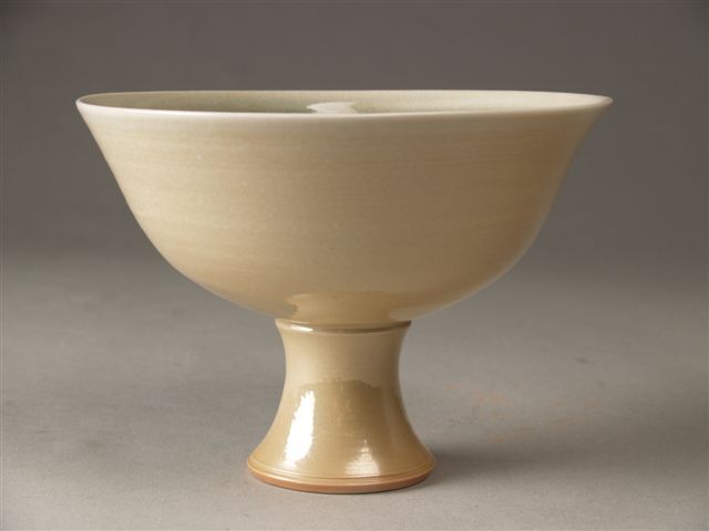 Stemcup op hoge voet met dunne, licht spreidende wand, binnenzijde celadonglazuur, buitenzijde licht crèmekleurig glazuur