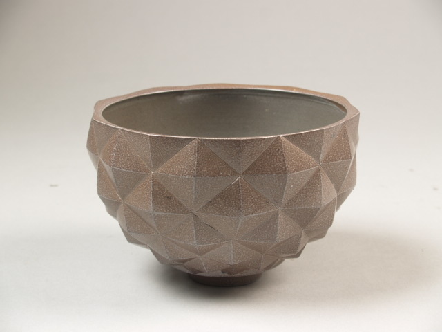 Kom op smalle voet met uitgesneden geometrisch patroon van facetten in reliëf, overdekt met donkerbruin-grijs licht lusteriserend glazuur