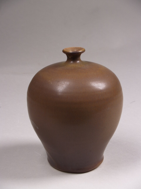 Balustervormige vaas met smalle hals en klein licht spreidende tuit, overdekt met bruin glazuur met geel/groene en blauwe accenten