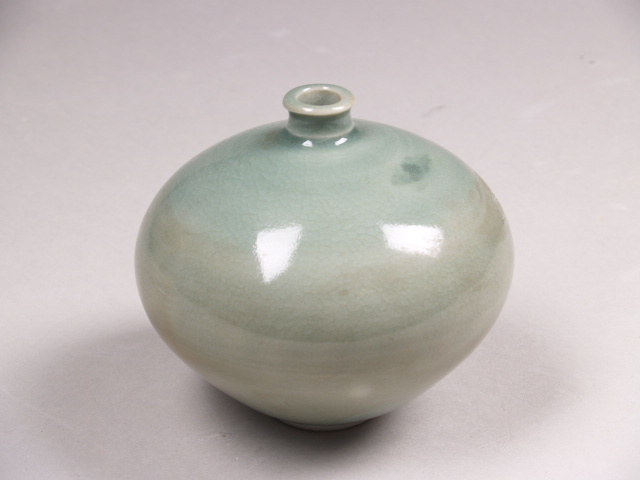 Bolvormige vaas met smalle, opstaande korte hals. Overdekt met een semi-transparant, celadon craquelé glazuur